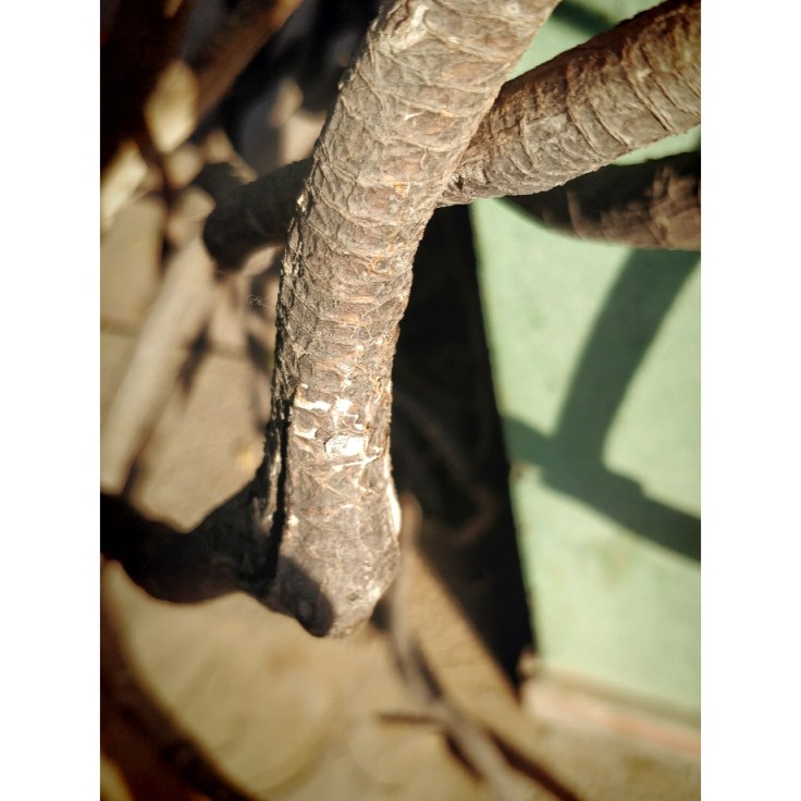 To leave a tear in the earth? In the earth I called home? Both of us, me and my husband never fathom how to let go of lives around us just coz they didn’t yield what was expected out of them. We were taking it emotionally I was told. This tree grew more than 15 feet right infront of us. Without any attention or care. Took from the earth and the sun what rightfully belonged to it – never cried or whined! Even supported the weed vines. Just let in just the right amount of sun when I sat out under it. Was I being emotional? From the trunk untill the leaves started, it got divided into 3 steady branches- each holding onto it multiple others. Never leaning, never spreading. Never claiming the sun of others.
